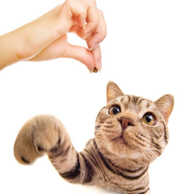 Using one of your cat’s favourite food treats, move the food over their head and as their gaze follows the food and their head moves back, their rear end will naturally lower into a sitting position. At this point give the food to your cat while it is sitting.